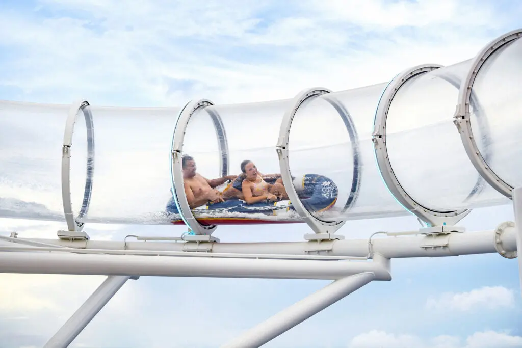 Disney Cruise Line’s Wish-class ships brought the next generation of water coasters to Disney Cruise Line: AquaMouse, available on the Disney Wish, Disney Treasure, and now the Disney Destiny. AquaMouse comes with everything you’d expect from a Disney attraction: a story, characters, just enough thrill that all ages can enjoy, and yes, even a line to stand in before you ride.