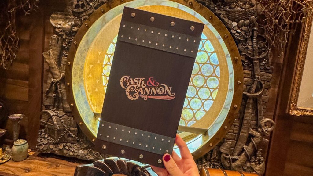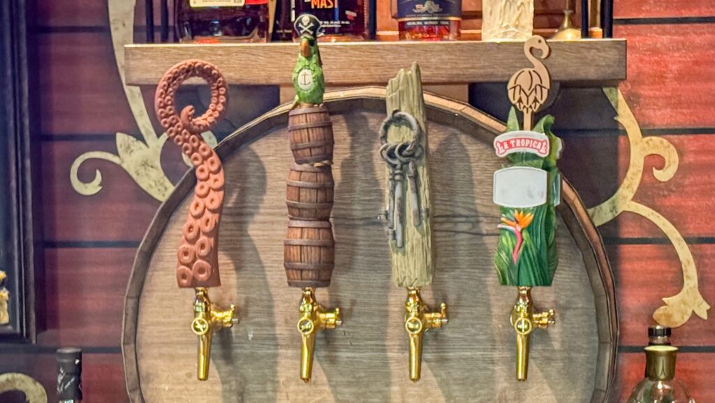 That doesn’t mean this space phones in the details. On the contrary, Cask and Cannon has floor-to-ceiling references to Pirates of the Caribbean (literally – the detail in the carpet and on the ceiling is incredible). Tap handles are carved to resemble beloved characters and details from the ride, like the Barker Bird and the prison keys held by the four-legged watchdog at the end of the attraction.