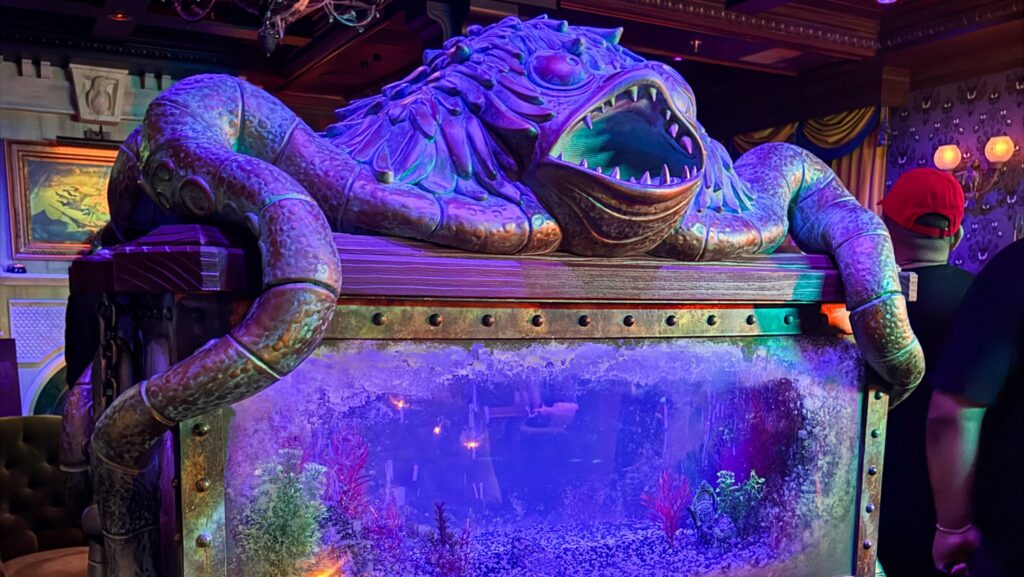 This time, as the story goes, we are in a Captain’s parlor on an esteemed steamship, fitted with luxurious furniture and ornate finishes that give the feeling of eerie opulence. Nautical touches pay homage to the early concepts of Haunted Mansion, including the Ghost Fish. This centerpiece of the parlor is the manifestation of renderings by Rolly Crump, an Imagineer responsible for much of the original Haunted Mansion attraction we know and love today.